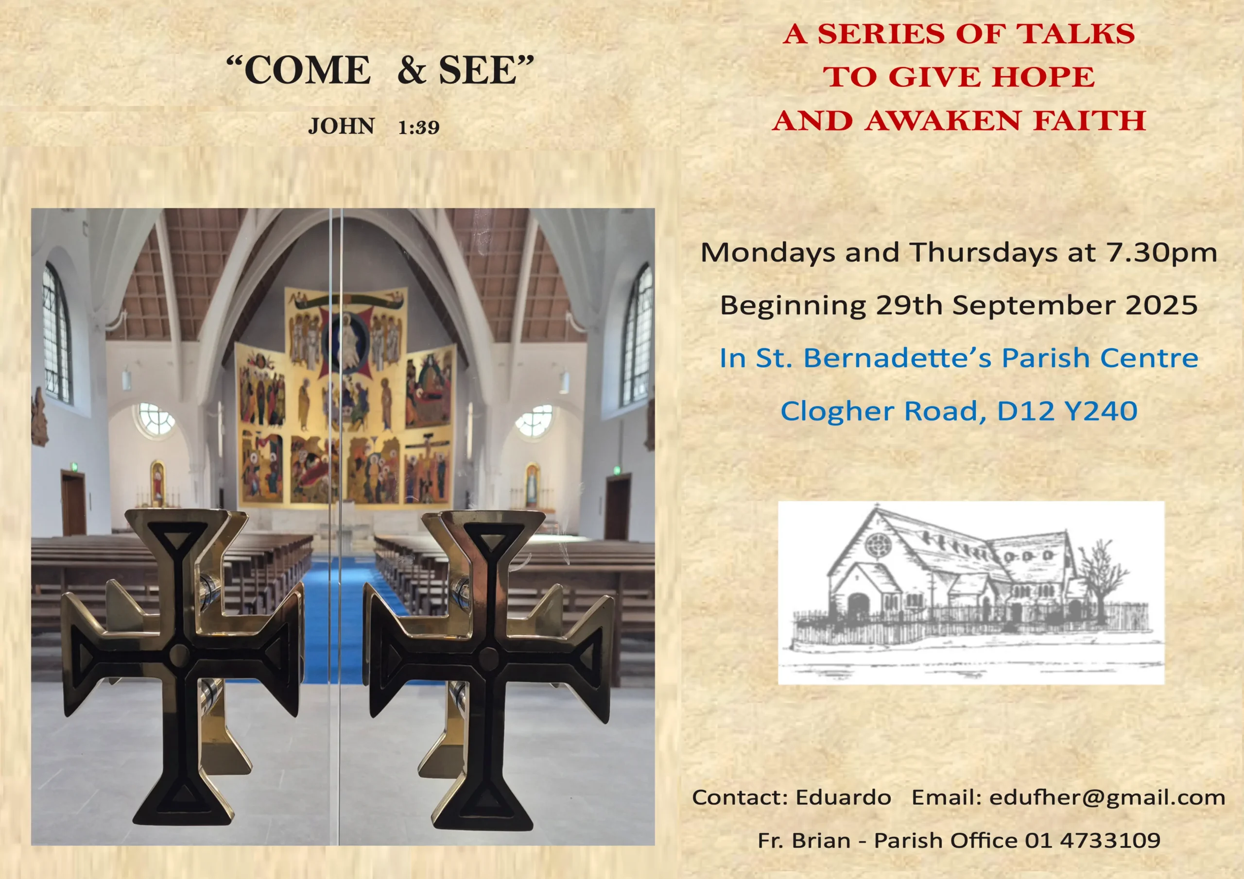 St. Bernadette’s Parish is located in the Archdiocese of Dublin on Clogher Road, Crumlin, Dublin 12.